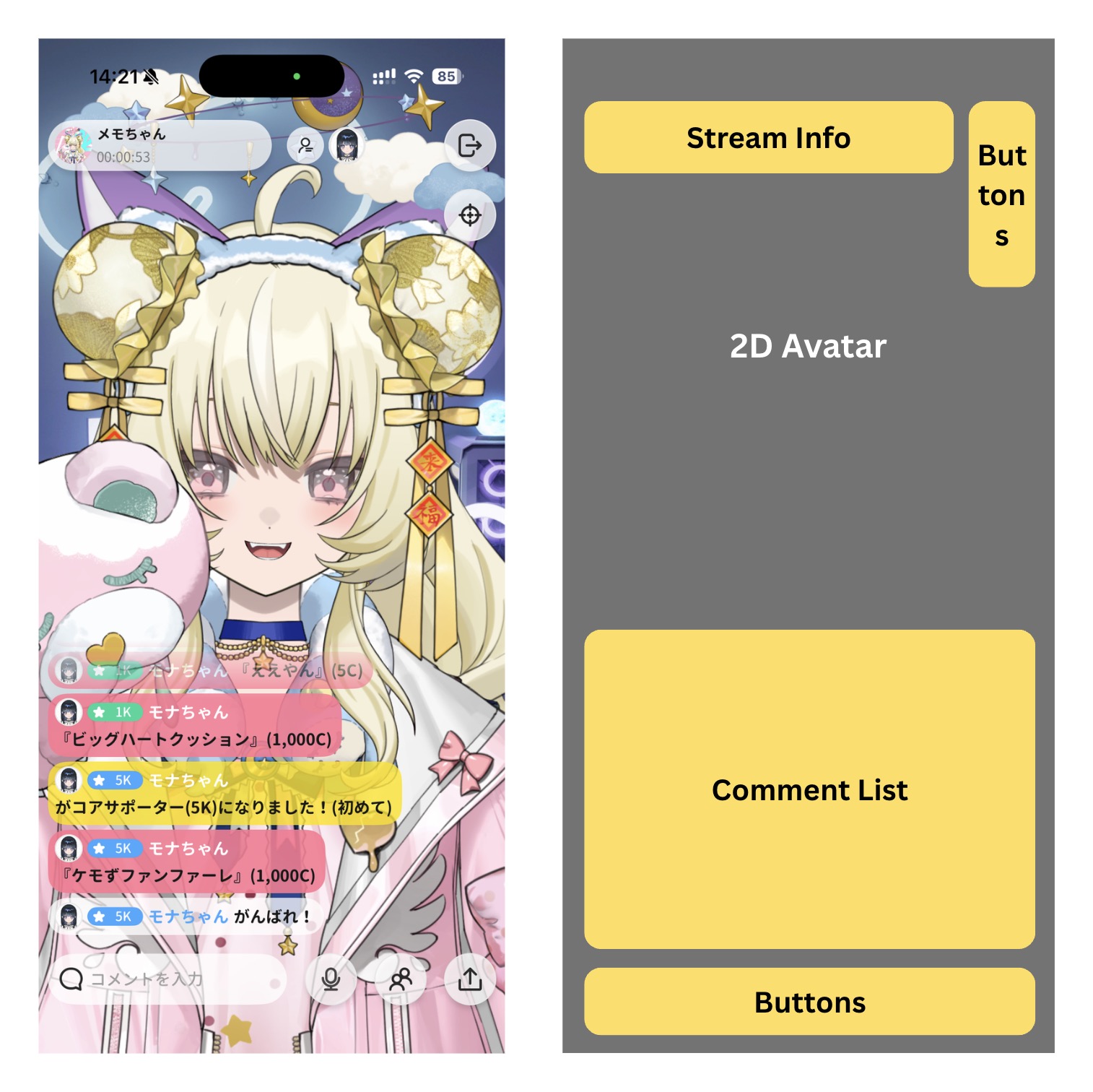 As an example, let’s look at the streaming screen. Unity sits at the bottom layer handling only avatar rendering, with native UI overlaid on top.